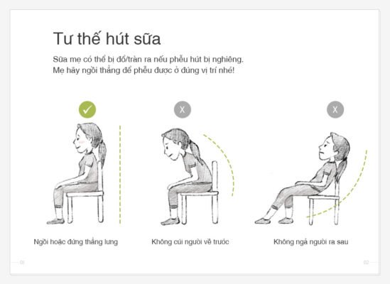 – Khi hút sữa, mẹ chọn vị trí thật thoải mái để hút sữa sao cho thoải mái và thân trên thẳng.