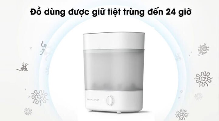 – Máy tiệt trùng bình sữa Philips có khả năng giữ môi trường vô trùng 24h dù chu trình đã kết thúc (với điều kiện nắp máy đóng chặt hoàn toàn).