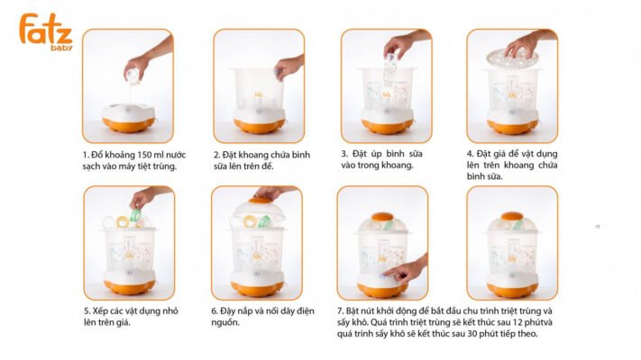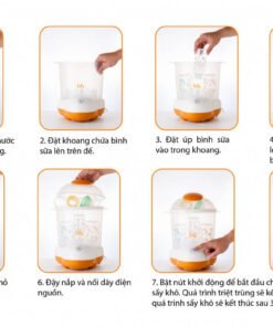 – Quá trình tiệt trùng sẽ diễn ra trong 12 phút sau đó sẽ chuyển sang qua trình sấy khô trong vòng 30 phút. Giúp mẹ tiêt kiệm thời gian và công sức rất nhiều.