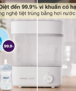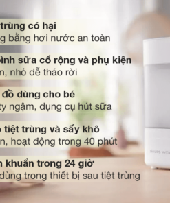 – Máy Philips Avent SCF293.00 có khả năng tiêu diệt tới 99% vi khuẩn có hại và làm khô bình sữa trong 40 phút.