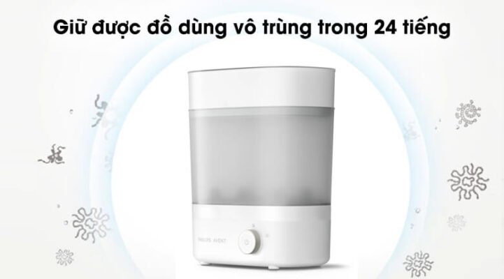 – Máy tiệt trùng sấy khô Philips có khả năng khử trùng trong 24h dù chu trình đã kết thúc (với điều kiện nắp máy đóng chặt hoàn toàn).