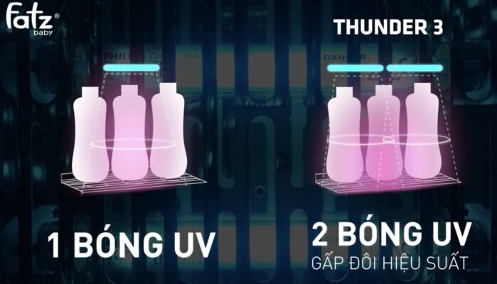 – Máy tiệt trùng Fatzbaby được trang bị 2 đèn UV để tiệt trùng thời gian nhanh hơn và hiệu quả hơn so với 1 đèn. Với máy FB47163TN thời gian tiệt trùng chỉ từ 5 – 10 phút.